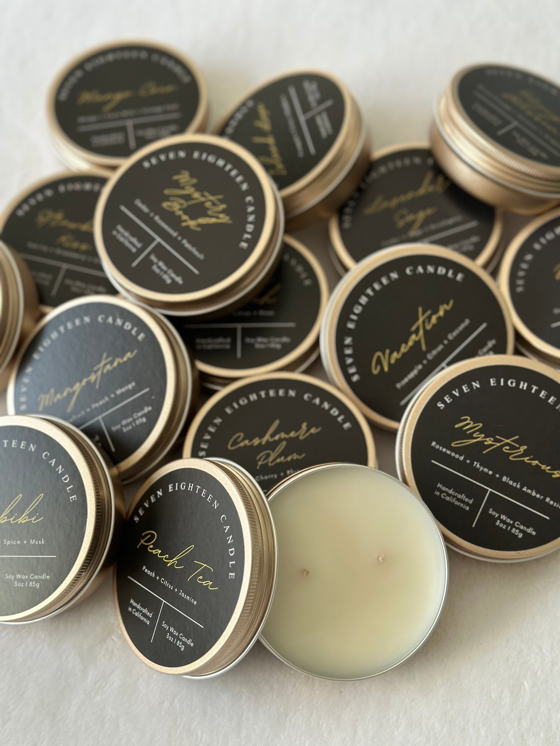 3oz soy wax, double cotton wicks, gold tin, burns up to 20 hours.